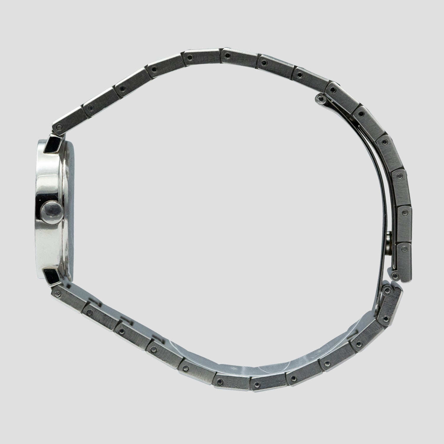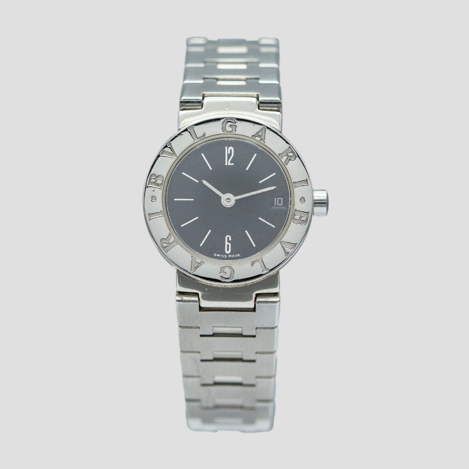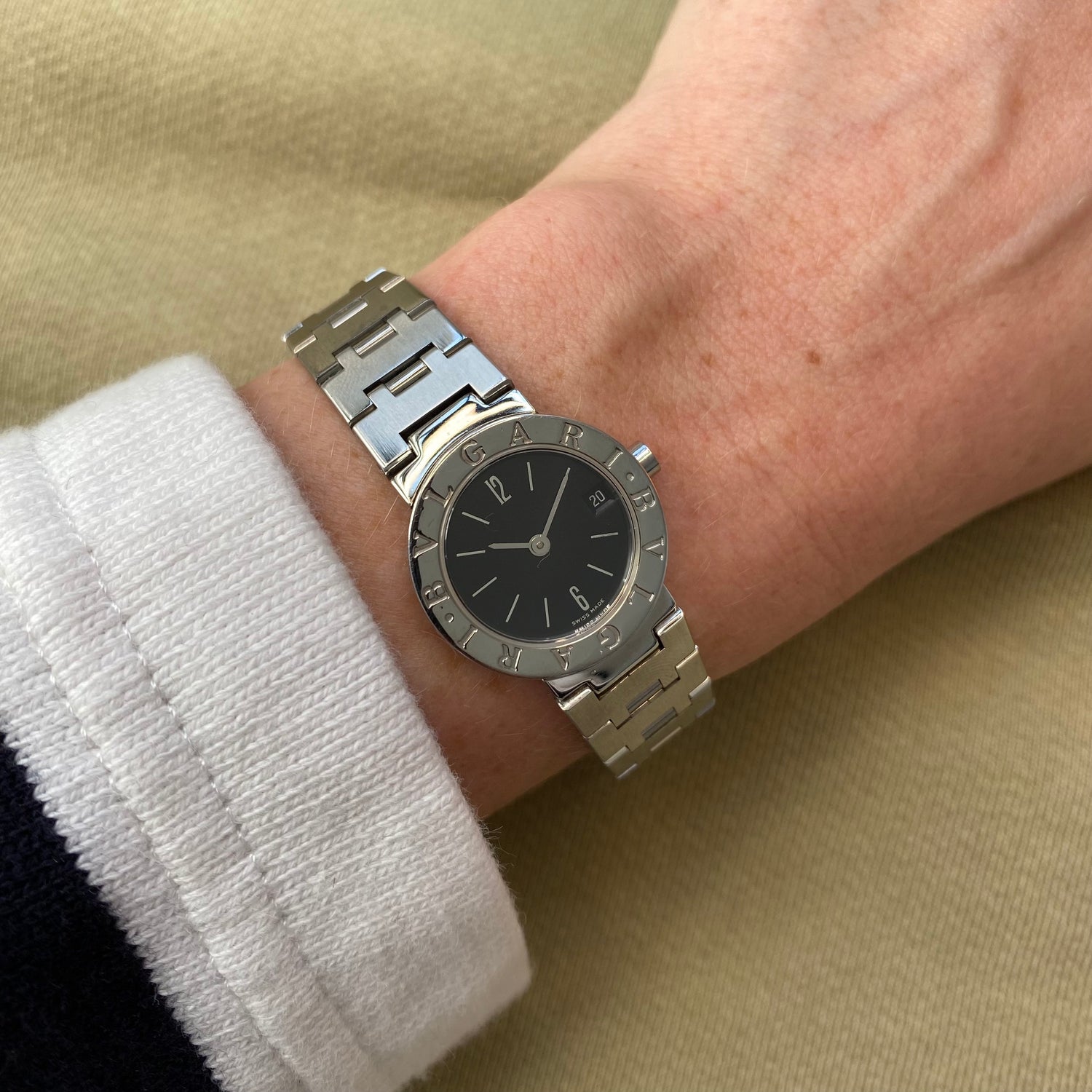 A stainless steel Bulgari Bulgari watch on a bracelet. This is a great everyday watch from one of the world’s most iconic jewellery houses: Bulgari. This watch is very classic in design with a black dial and a combination of long stick hour markers and the Arabic 12 and 6. The watch came in two variations: date and no date. This example is the quick set date version.