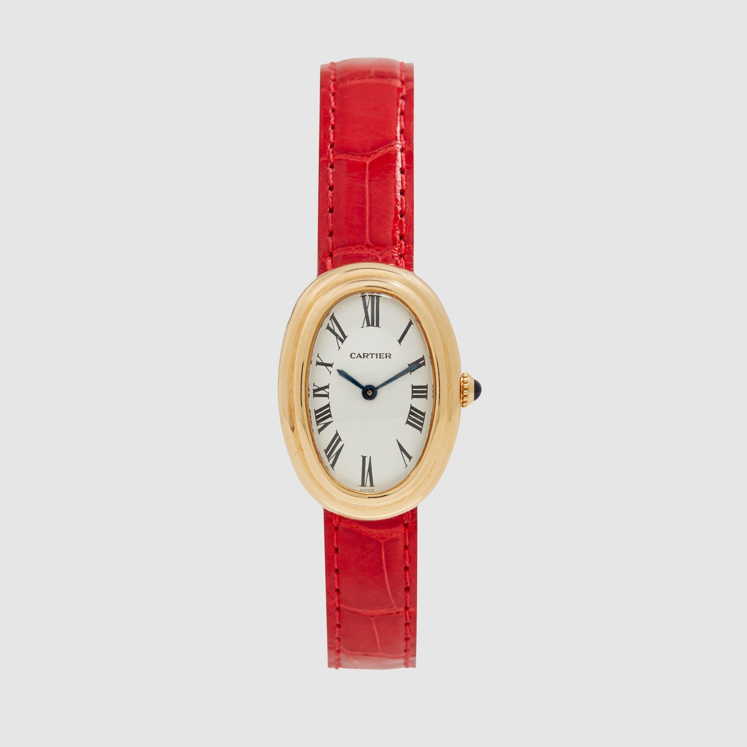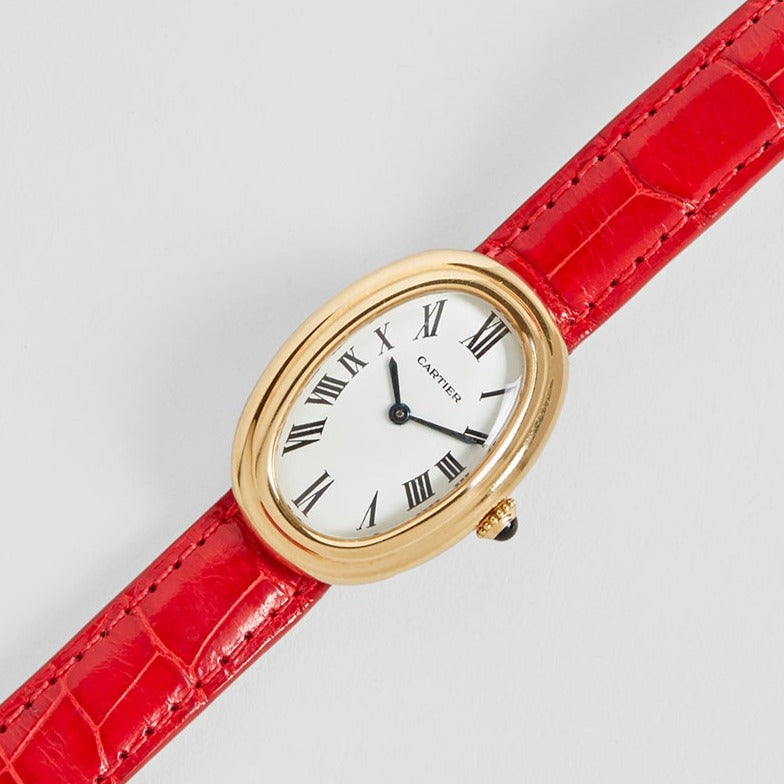 The watch comes with the original, fully signed, solid eighteen carat yellow gold deployant buckle. The red alligator band can be changed out if required for a more classic color.