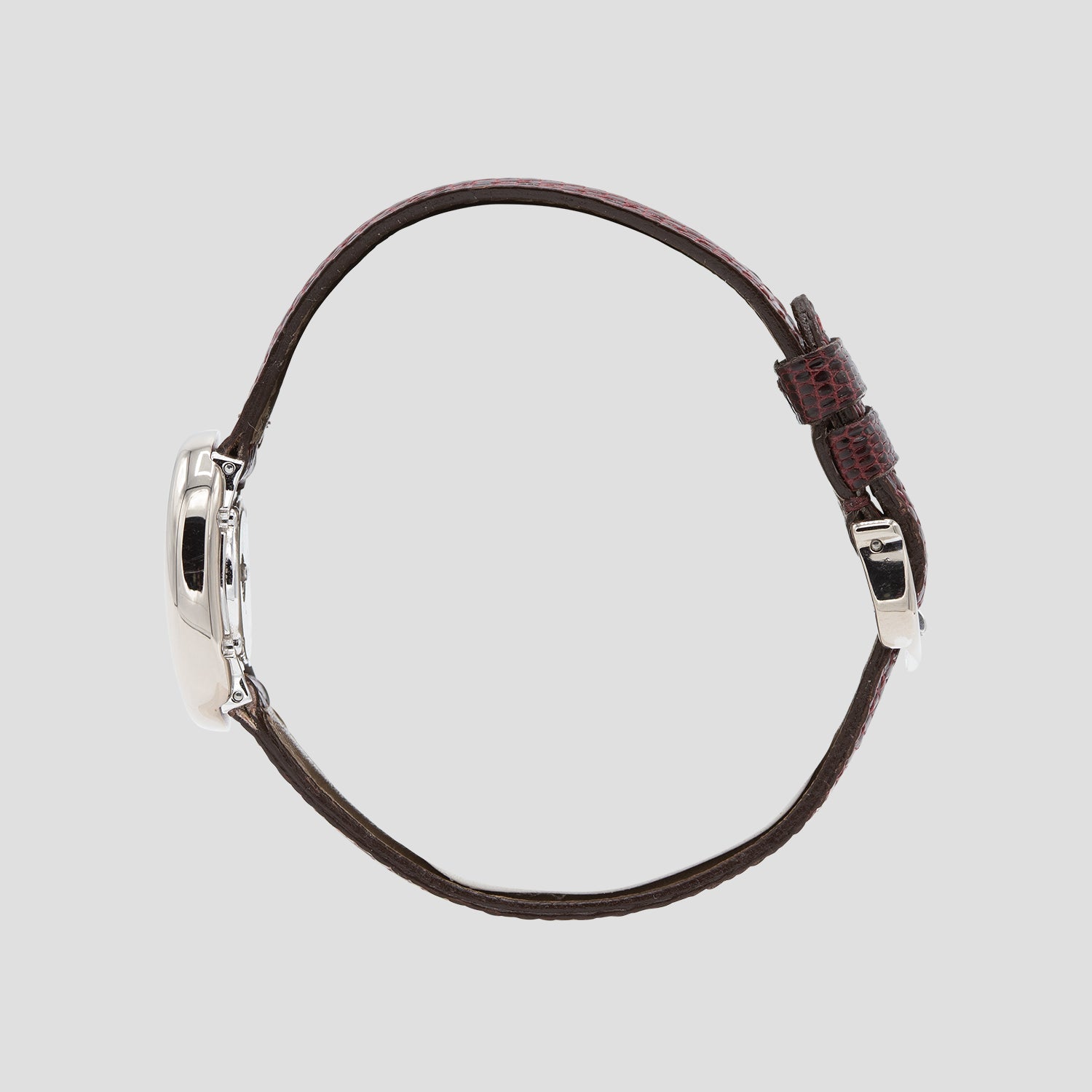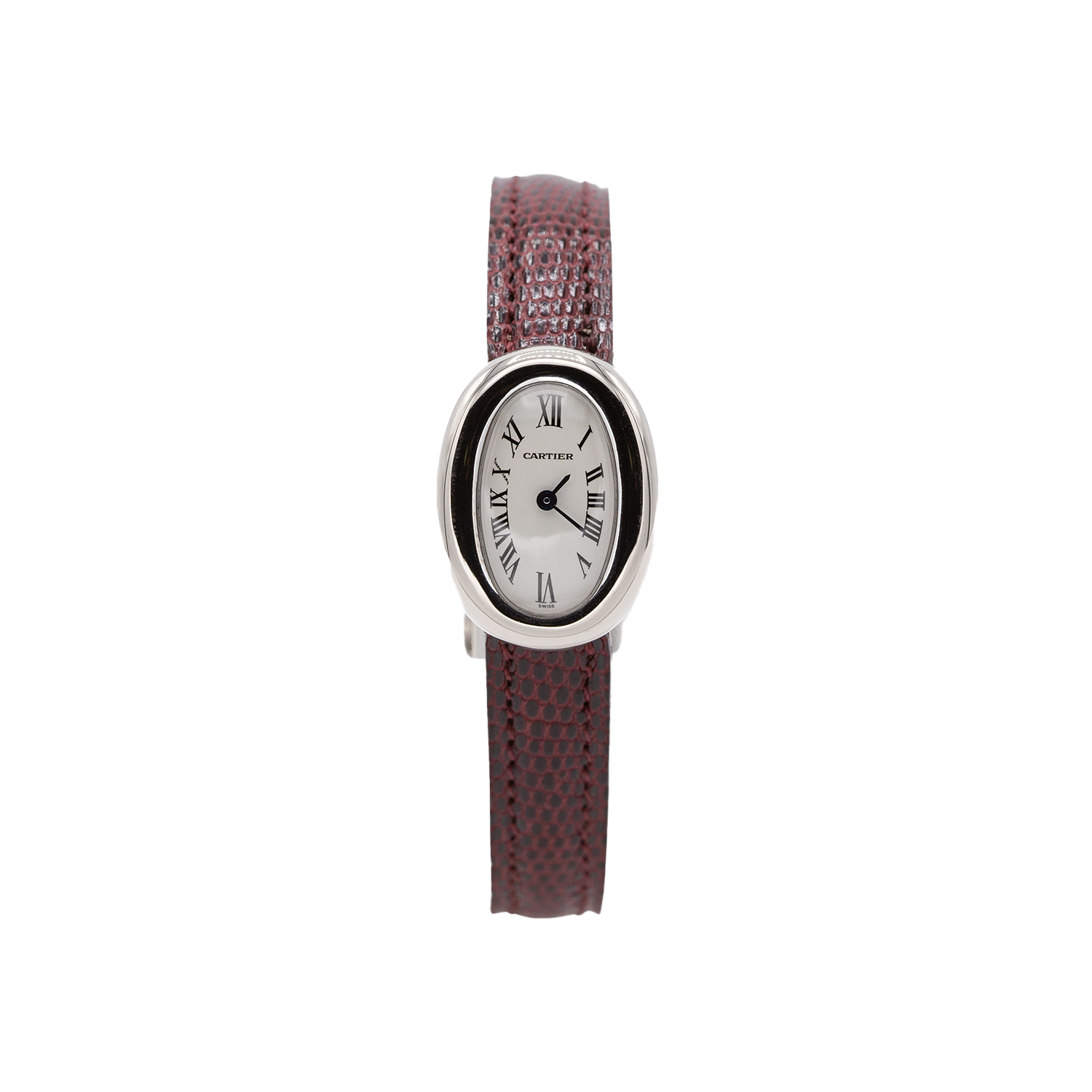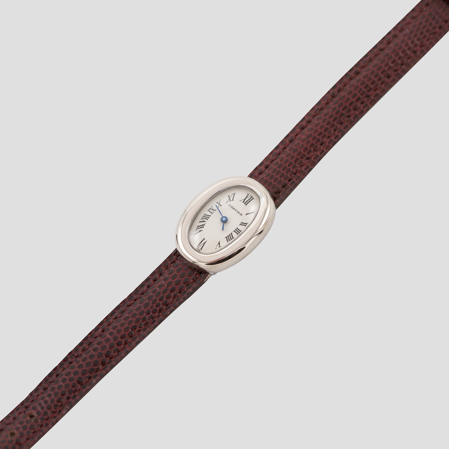 The watch comes with the original, fully signed, solid eighteen carat white gold ‘tang’ buckle. The burgundy lizard Cartier band can be changed out if required for a more classic color.