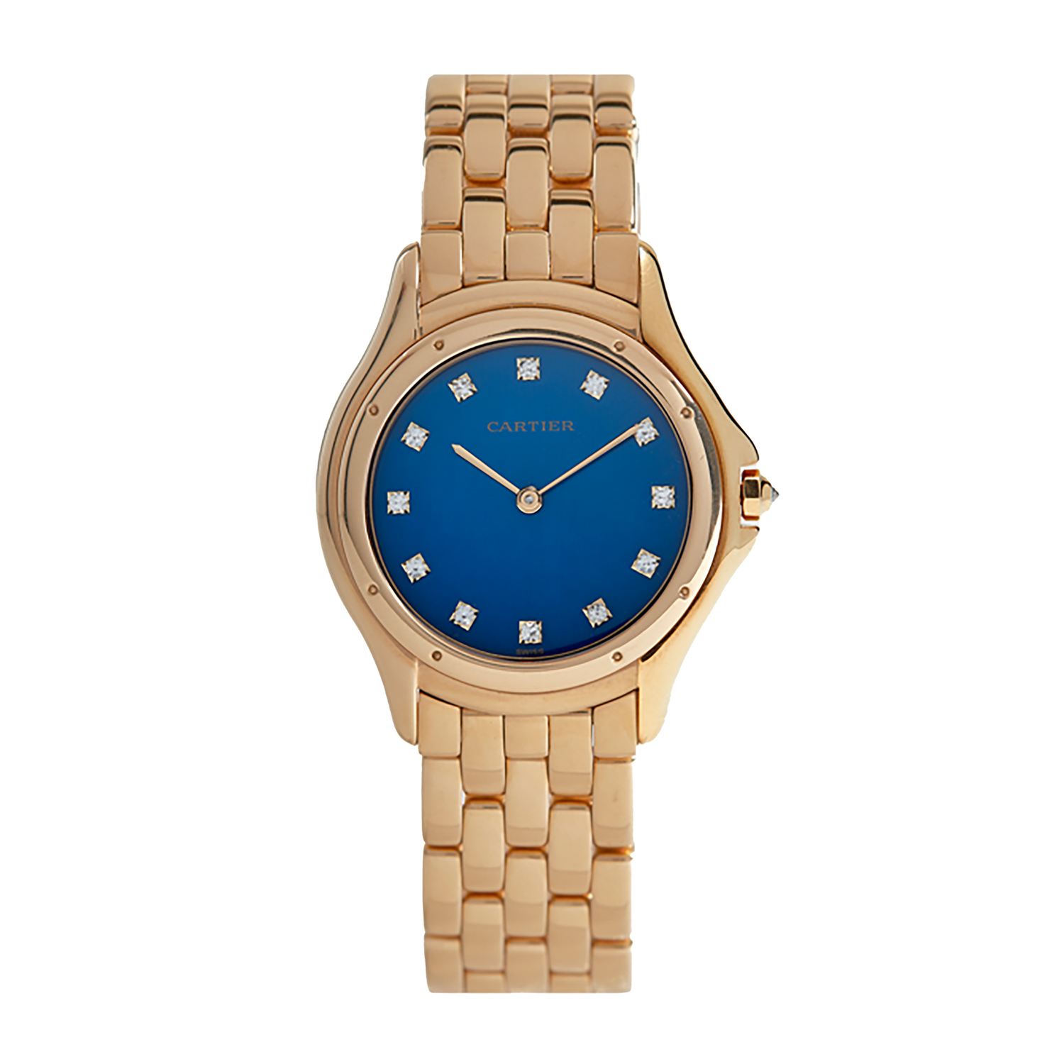 The dial on this example is the opposite of iconic Cartier design, which is an egg shell dial, black Roman numerals, blue steeled hands and the discreet "hidden" signature. This time, a very bold – almost midnight – navy blue enamel glossy dial is used. Small princess cut diamonds pick out each hour marker, and the "Cartier" signature and "Swiss" below the six o'clock marker are printed in a gilt font that stands out beautifully from the dial. Again, another step away from classic Cartier styling is the use of a diamond set into the crown, instead of the classic cabochon sapphire. This design cue would later on become the hallmark for their highest level of watch making, known as the "CPCP" or "Priveé Collection". So this watch was an early trendsetter towards that.