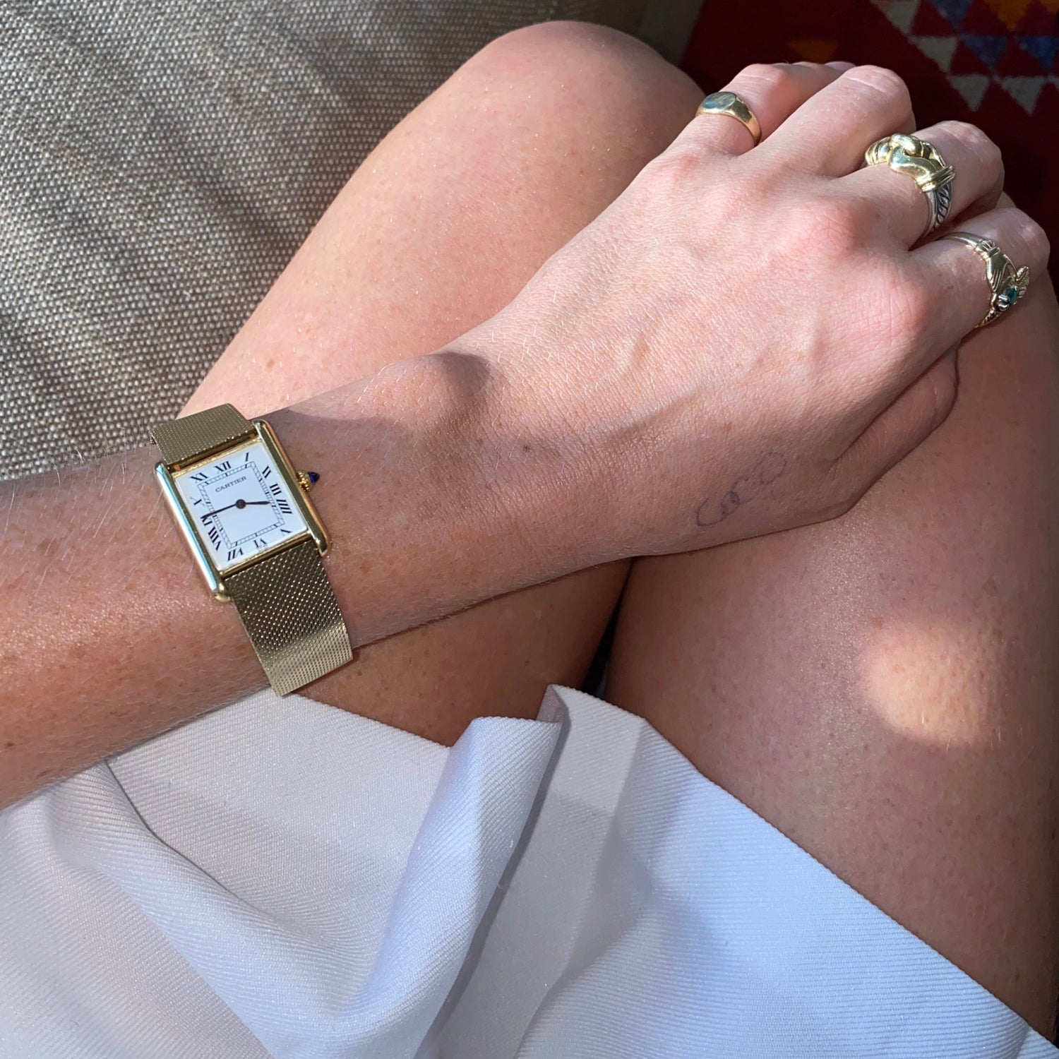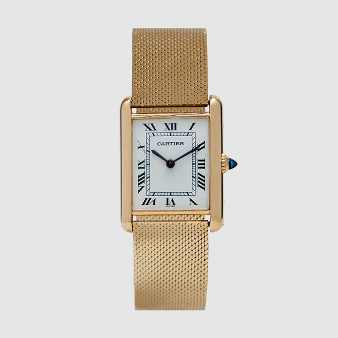 A solid eighteen carat yellow gold mechanical Cartier Tank with gold deployant and fine mesh bracelet. Perhaps one of the most iconic watches of all time (and certainly one that has been desired by and worn by some of the most celebrated figures of the 20th Century to this current day). In fact, it feels that this special gem of watch design is actually entering into a renaissance in its desirability and collectibility – especially original mechanical examples from this era.
