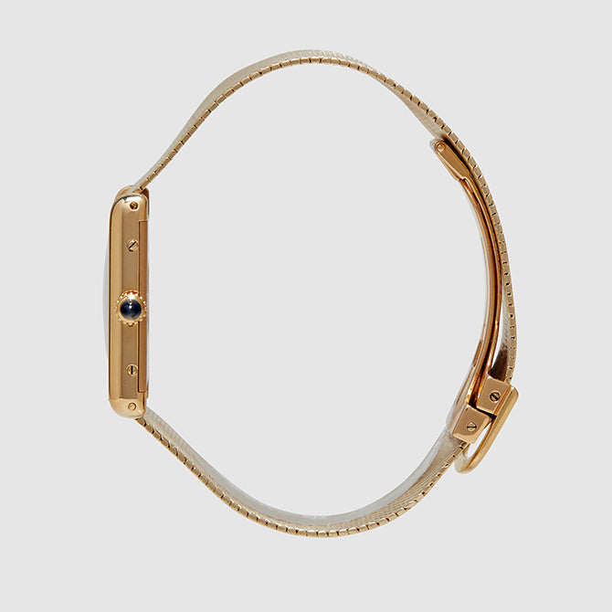 The watch sits on a fine and beautifully made solid eighteen carat yellow gold mesh bracelet, seamlessly joining the case and opened through the traditional Cartier deployant butterfly clasp on the back center. The inside of which is fully stamped with Cartier control marks and gold assay marks. This bracelet is not fixed to the watch itself. It is held on by two long screws that run through the lugs of the watch, meaning that if there was a desire to have it on a leather band, this is wholly possible (which can be attached to the Cartier deployant as well). This is also attached to the end of the mesh by two long screws, which can be removed and then threaded through a custom made band. The bracelet currently measures approximately seven inches in length.