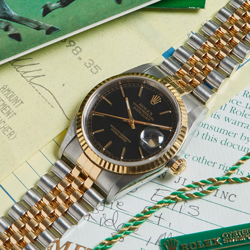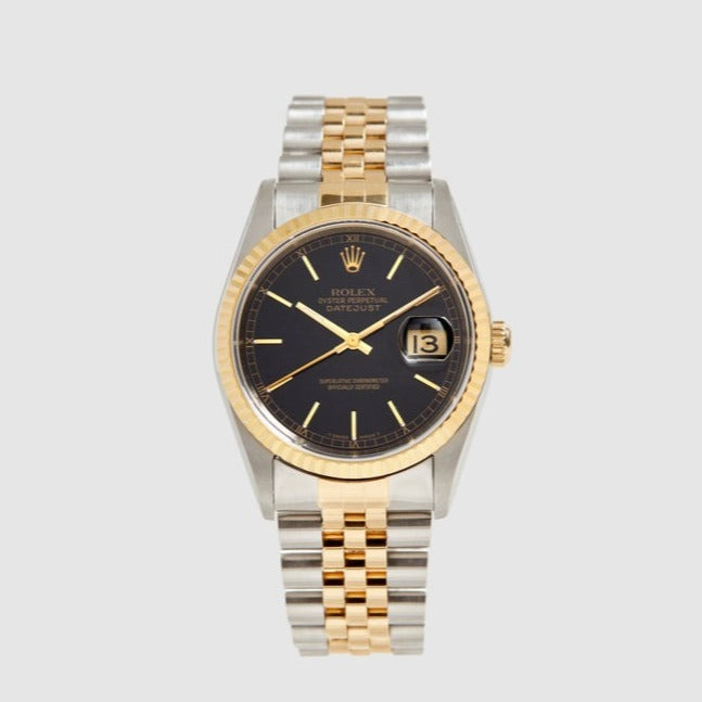An automatic stainless steel and eighteen carat gold Rolex Oyster Perpetual Datejust reference 16233 model. This example has a stunning black dial with gilt print. Perhaps one of the most iconic combinations in Rolex history, harking back to the 1950's and '60's sport watches. The dial configuration is very typically Datejust: stick markers and baton hands. There is the addition of the small printed Roman numerals in the chapter ring providing a small level of detail. This dial is very special when under very strong direct sunlight or bright light it is turning a stunning coppery brown. This, I am sure, will continue as the dial ages in natural light. It will become "tropical", it would appear. Something to enjoy in the future as the watch ages.