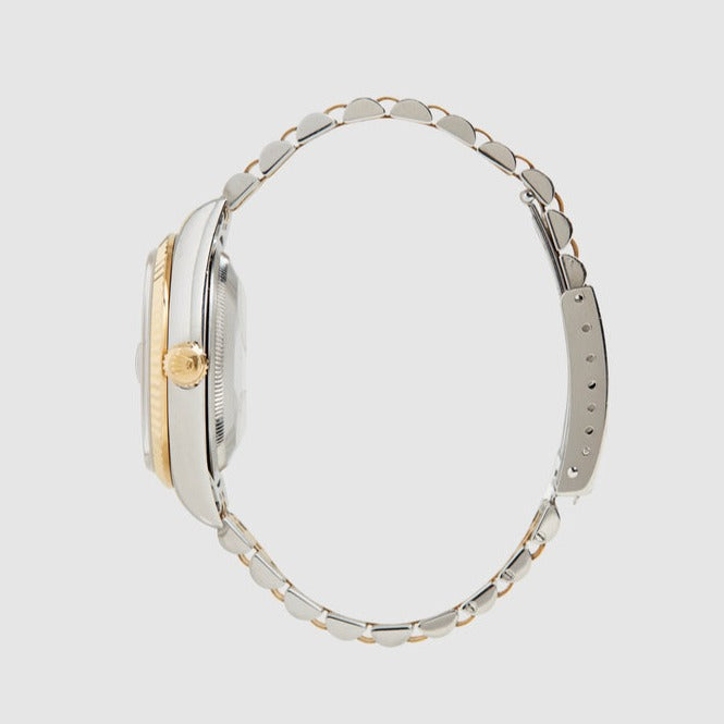 The watch comes on a two tone Rolex Jubilee style stainless steel bracelet. The classic coin edge bezel is also in eighteen carat yellow gold. This has the more modern case where the lug holes are now concealed, known as the "no holes" case. This was an improvement that Rolex made to the case toward the end of the 1990's, making this an early iteration of this case.