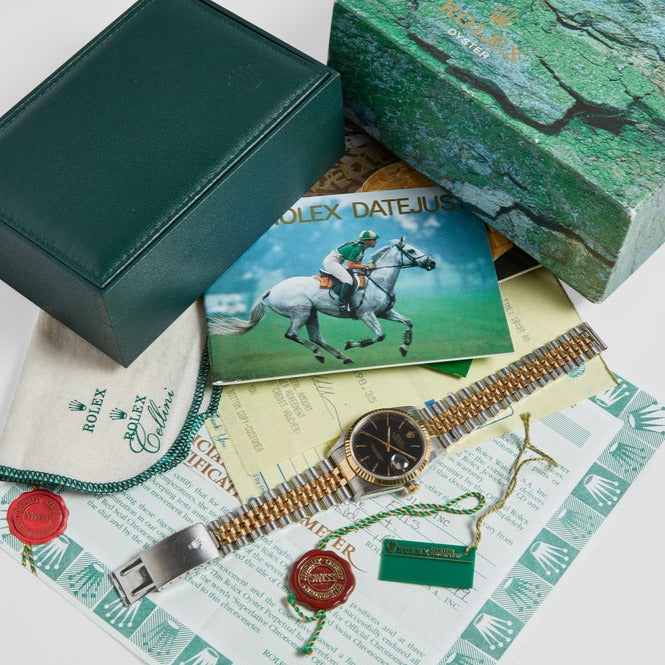 The watch was made circa 1999 with serial number A119XXX . The watch is in original condition, appearing to be unpolished. The term "full set" is used to describe watches that come with their original warranty paperwork. However, this is as complete a "full set" as can be found: wax seal tag, Rolex green tag with corresponding serial number, the factory service brochure, Datejust brochure, Oyster brochure, outer box, inner wooden box, warranty paperwork and even the original bill of sale from 2000! A very rare complete set indeed. The watch comes with a Foundwell one year warranty against mechanical failure.