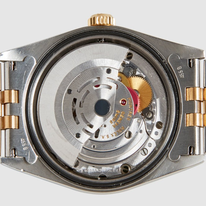 The watch is powered by a Rolex, Swiss made, thirty-one jewel automatic calibre 3135 movement that powered the majority of all Rolex models since its launch in 1988, from the Datejust to the Submariner. These later models can be identified as they do not have the earlier, characteristic, 'pie pan' style dial. This model also comes with the more ergonomic 'Quick Set' date function, and the newly designed smaller profile case, all of which were introduced in the 1970's.