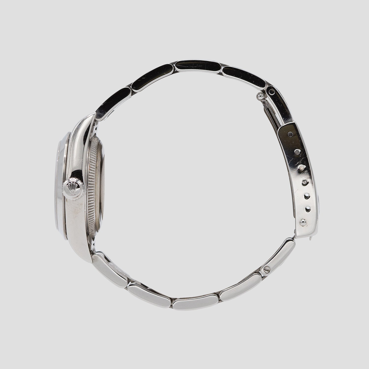 The case is in excellent condition throughout and appears to be unpolished. This is a “no holes” case, meaning that the lug holes are not drilled and exposed from the sides of the case, making for a cleaner finish. There is a protective sticker on the case back. This may be the factory one, although it is not Rolex green or signed. Either way, it has meant the case back is in factory original condition behind it. The original Oyster link bracelet is in excellent condition throughout with no sag or heavy scratching to the deployant buckle. This watch really is a fine example of clean and classic Rolex aesthetics all bundled up in a beautiful small package