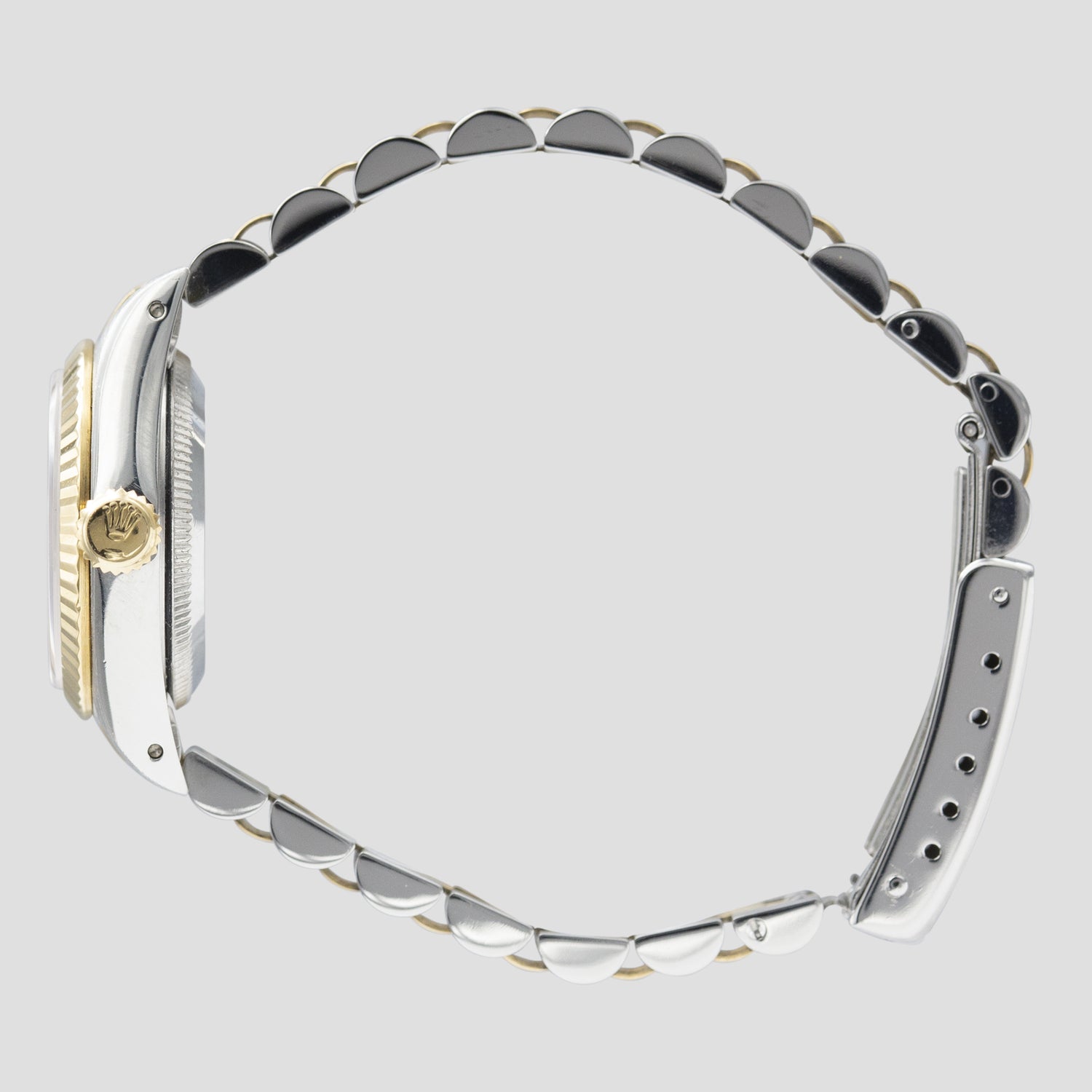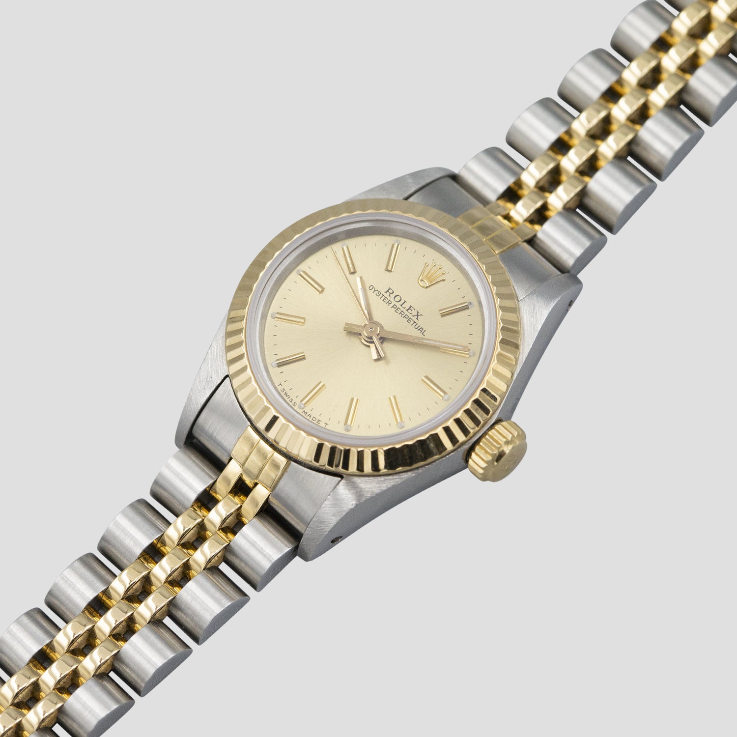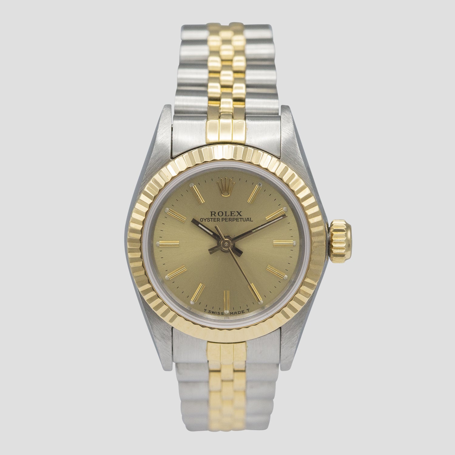 The dial color is the ‘standard’ for this model in two-tone – a gold, champagne dial. The luminous material used on the dial here is tritium, which was used up until the end of the 1990’s. (hence the “T Swiss T” marking at the base of the dial). It is all original and remains untouched and in excellent condition, featuring every lume plot intact, remaining very close to their factory white color. This color will continue to evolve with time and the lume will become even more attractive – part of the beauty of tritium.