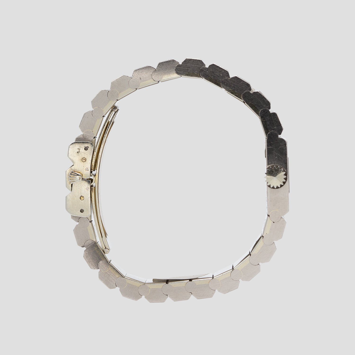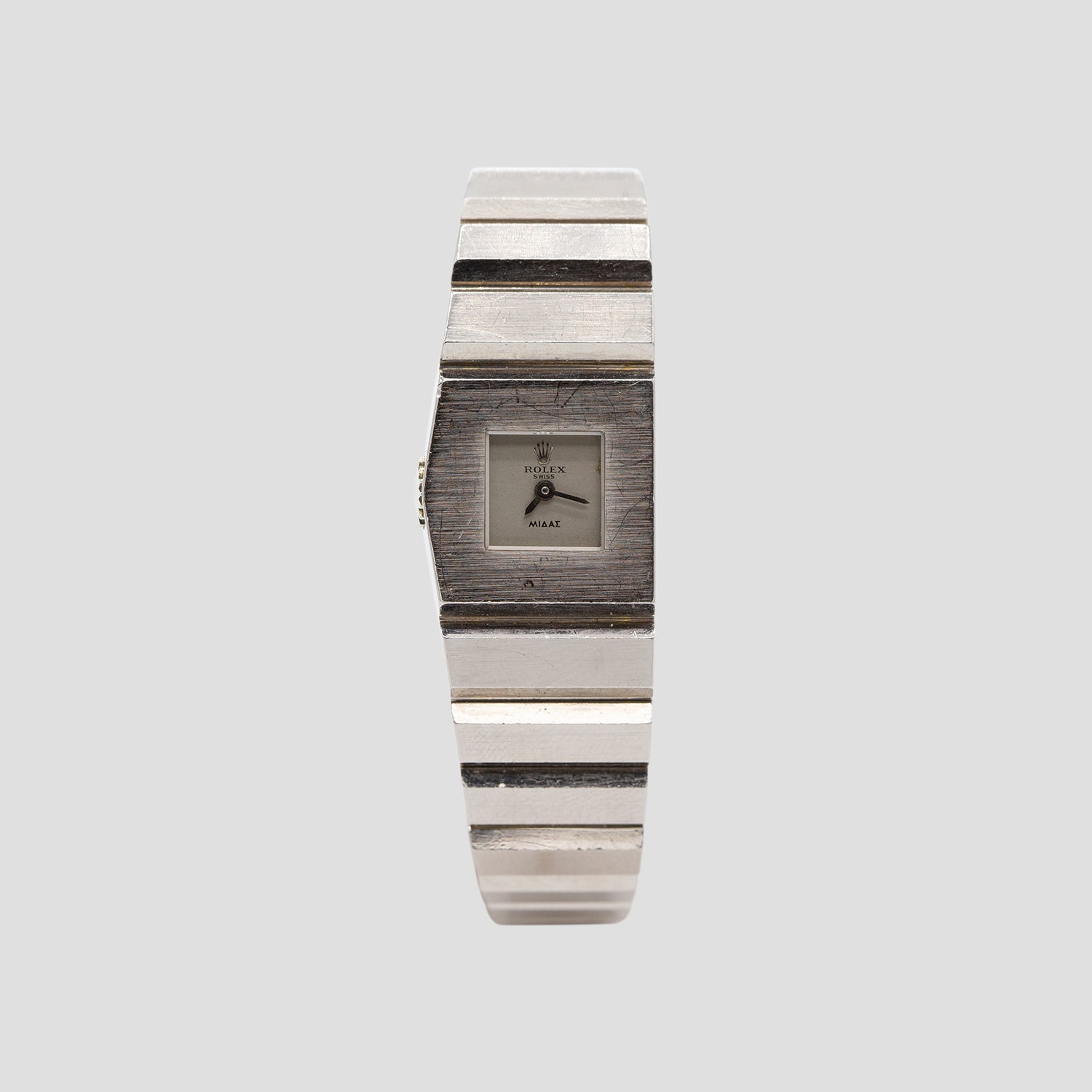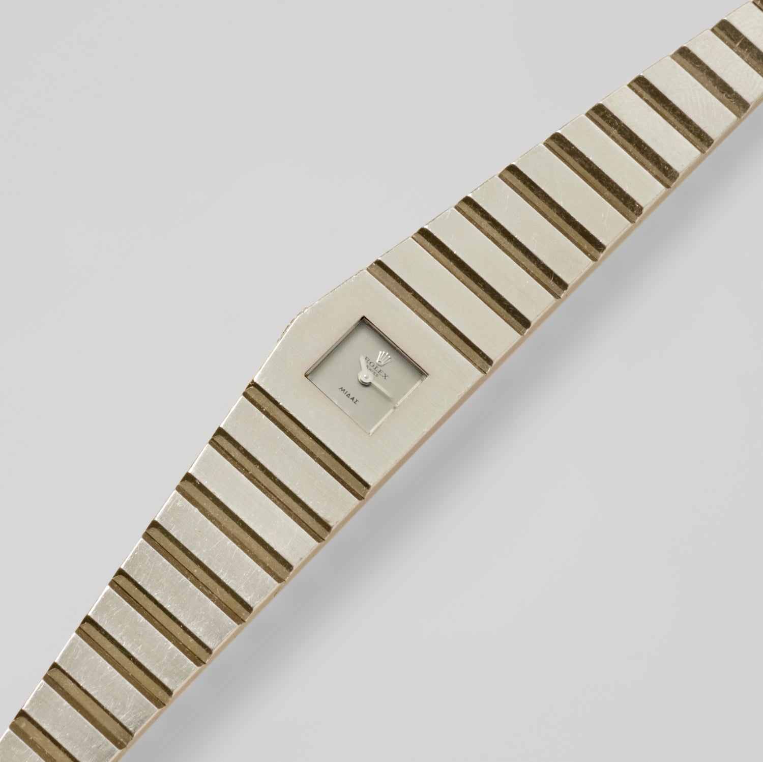 A solid eighteen carat white gold Rolex "Princess Midas" manual wind wristwatch. Love it or hate it, this watch is very difficult to ignore. It is essentially an amazing bracelet made from a chunk of solid gold, which the famed Gérald Genta had a hand in designing. The quality of the make and the richness in construction speaks for itself. The design may seem like a child of the 1970's; however, the King, Queen and Princess Midas first appeared in a Rolex catalog as early as 1962. Given its very bold and daring design, especially when compared to every other model that Rolex was launching or running in their line at this time, the watch must have appeared to have come from another planet.