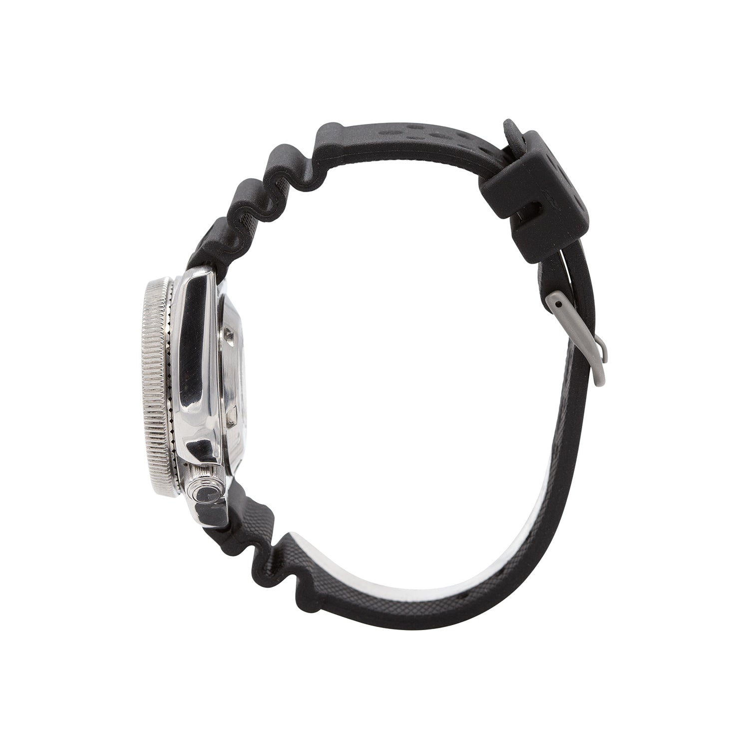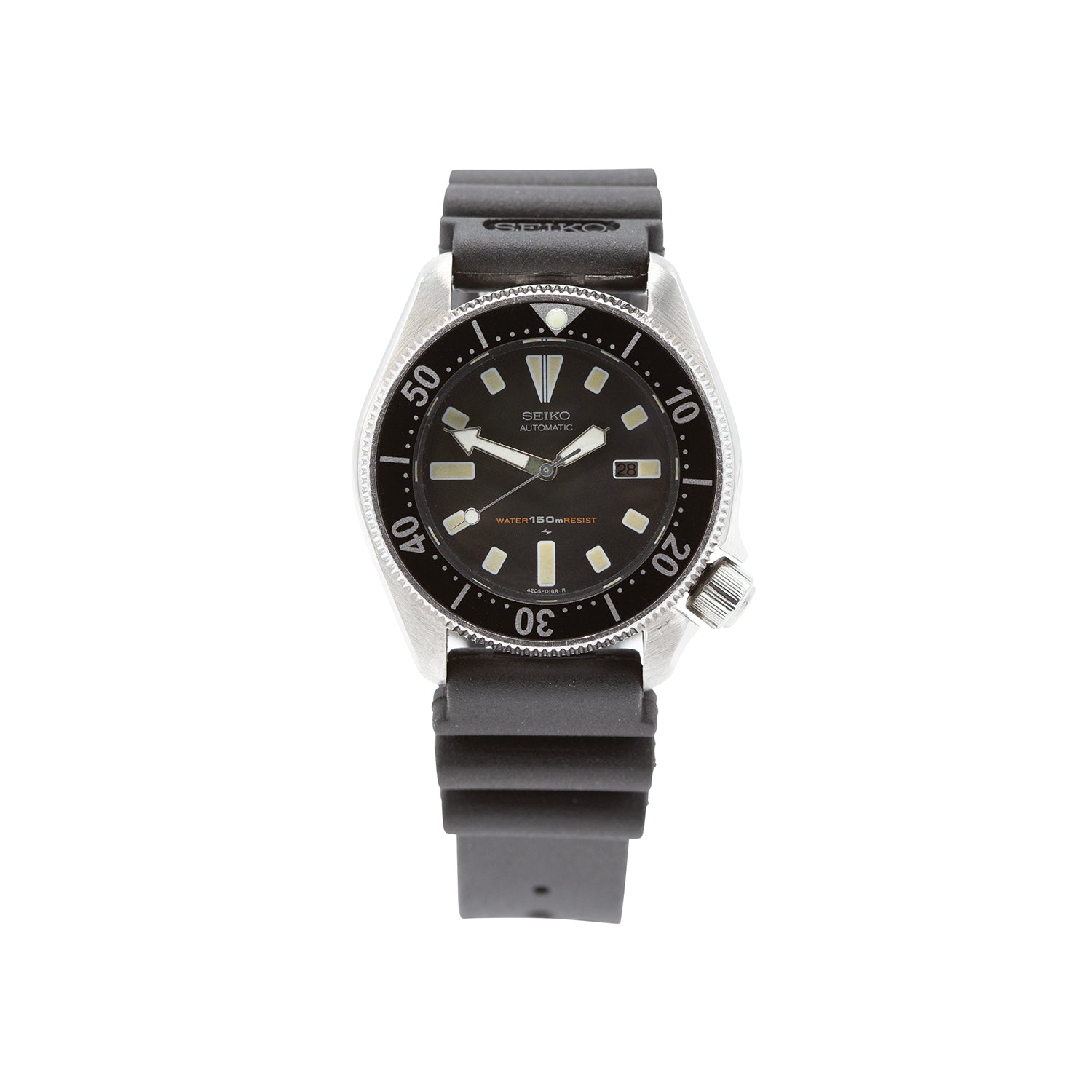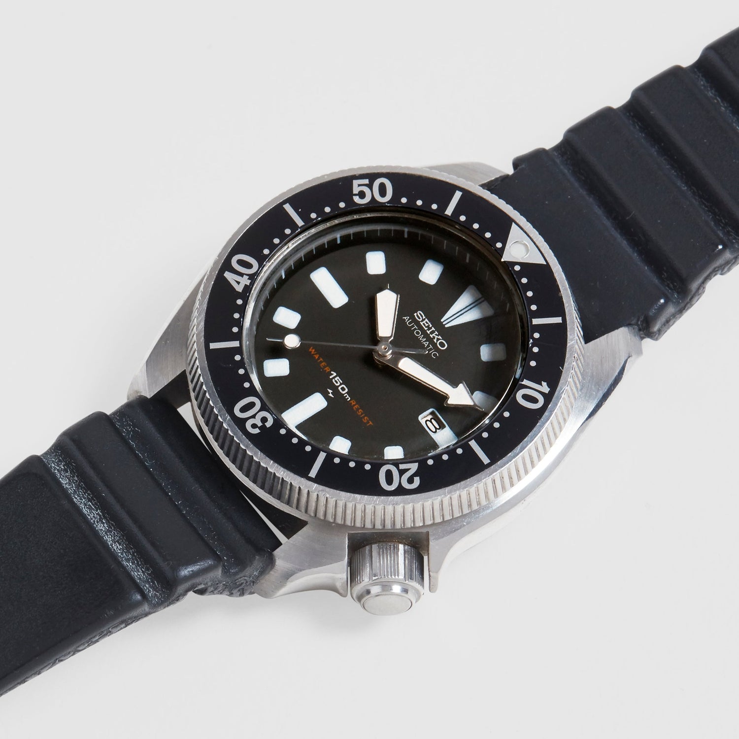 A stainless steel Seiko automatic diving watch on the original NOS rubber strap. This model is the smallest size that Seiko made in this diving range. Measuring in at 33mm across, not including the crown, this model was introduced more for the ladies market, at the time. However, being a thick case, thanks to the patented "Hardex" crystal, strong case, and thick coin edged bi-directional bezel, it wears larger than the size may suggest.