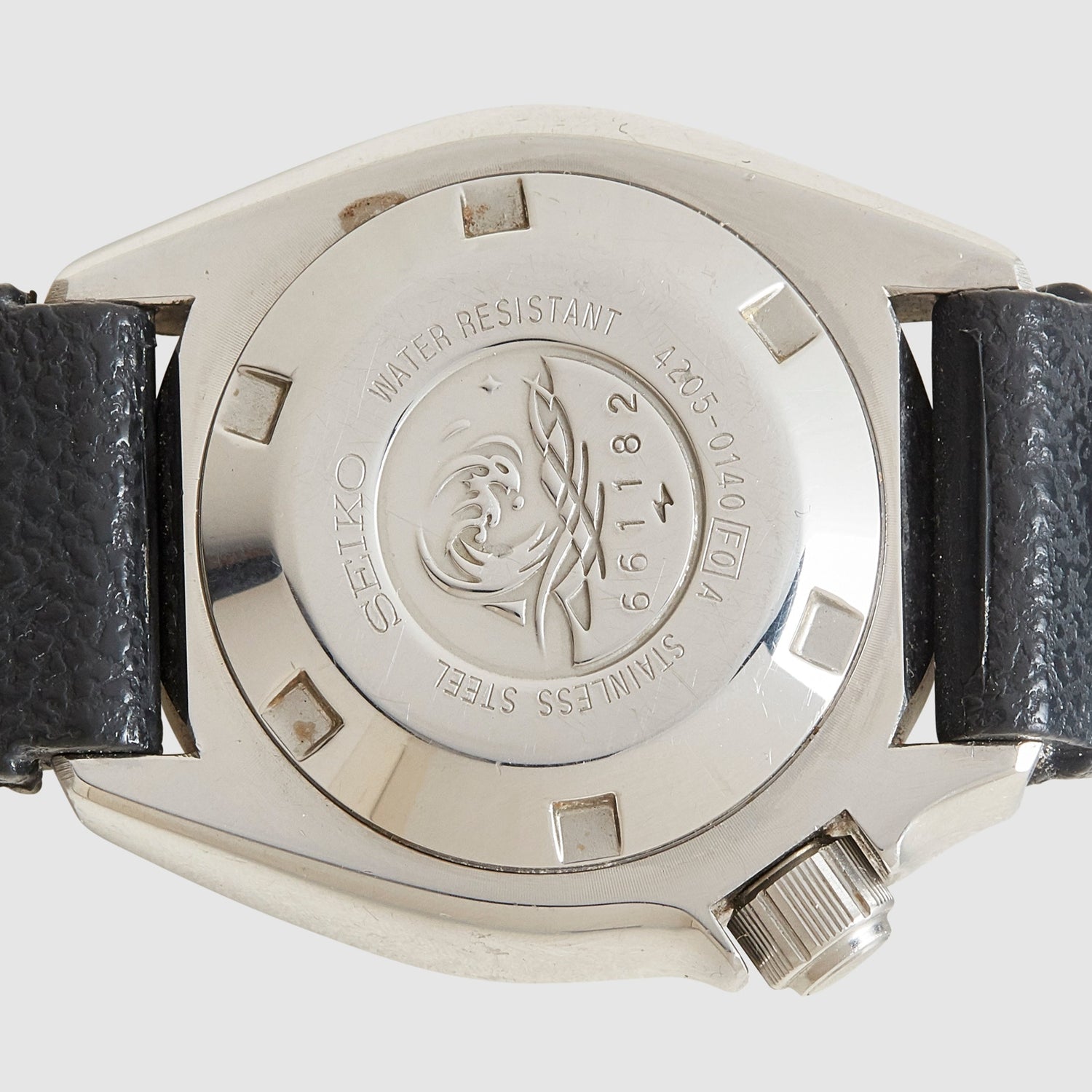 The design of this watch is iconic Seiko – the case has the screw down crown located at the four o'clock position with crown guard, aforementioned thickness and bezel design. The dial with arrow marker at twelve o'clock, sword and arrow handset, with lollipop sweep and red printed "water resist" surrounding the depth rating in silver, atop the Diani-Seikosha symbol. This represents the factory from which this watch was designed and produced. The screw back case also features the iconic Tsunami engraved design which represents the watch's ISO dive rating abilities, and was found only on their dive watches.
